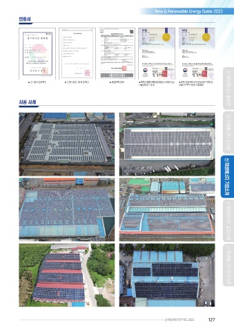 New & Renewable Energy Guide 2023 인증서 ▲ 전기공사업등록증 ▲ 난방시공업 제1종 등록증 ▲ 공장등록증명서 ▲ 특허증(계통연계형 태양광발전 시스템의 손실 ▲ 특허증(태양에너지의 경제성 분석 방법 및 산출방법 및 그 장치) 컴퓨터로 판독 가능한 기록매체) 신·재생에너지 홍보관 시공 사례 신·재생에너지 기업소개 신·재생에너지 전시회 신·재생에너지 유관기관 신·재생에너지가이드 2023 127 신·재생에너지 설치사례