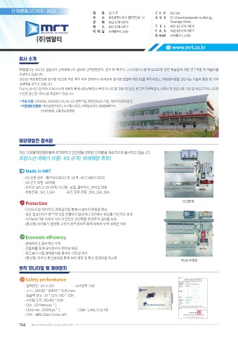 ㈜엠알티는 2011년 설립되어 신재생에너지 설비와 전력변환장치, 센서 및 제어기, 모니터링시스템 및 LED조명 관련 제품들에 대한 연구개발 및 제품화를