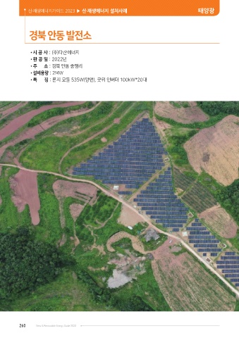 신·재생에너지가이드 2023 ▶ 신·재생에너지 설치사례 태양광 경북 안동 발전소 •시 공 사 : (주)다산에너지 •완 공 일 : 2022년 •주 소 : 경북 안동 중평리 •설비용량 : 2MW •특 징 : 론지 모듈 535W(양면), 굿위 인버터 100kW*20대 260 New & Renewable Energy Guide 2023