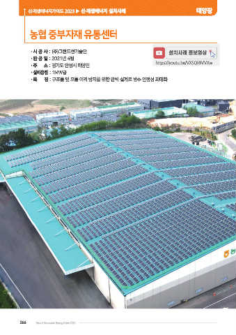 신·재생에너지가이드 2023 ▶ 신·재생에너지 설치사례 태양광 농협 중부자재 유통센터 •시 공 사 : (주)그랜드썬기술단 설치사례 홍보영상 •완 공 일 : 2021년 4월 https://youtu.be/VXSQIi9VVXw •주 소 : 경기도 안성시 미양면 •설비용량 : 1MW급 •특 징 : 구조물 및 모듈 이격 방지를 위한 완벽 설계로 방수 안정성 최대화 266 New & Renewable Energy Guide 2023