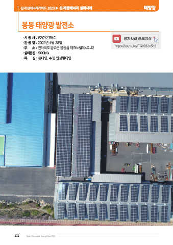 신·재생에너지가이드 2023 ▶ 신·재생에너지 설치사례 태양광 봉동 태양광 발전소 •시 공 사 : (주)가온ENC 설치사례 홍보영상 •완 공 일 : 2021년 4월 28일 https://youtu.be/fTG0932o5h8 •주 소 : 전라북도 완주군 봉동읍 테크노밸리4로 42 •설비용량 : 500kW •특 징 : 통타입, 수평 인삼밭타입 274 New & Renewable Energy Guide 2023