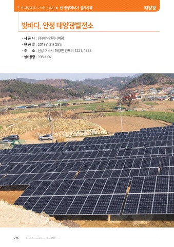 신·재생에너지가이드 2023 ▶ 신·재생에너지 설치사례 태양광 빛바다, 안정 태양광발전소 •시 공 사 : (주)이삭엔지니어링 •완 공 일 : 2019년 2월 25일 •주 소 : 전남 여수시 화양면 안포리 1221, 1222 •설비용량 : 198.4kW 276 New & Renewable Energy Guide 2023