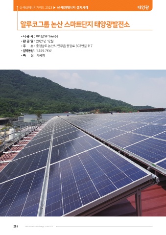 신·재생에너지가이드 2023 ▶ 신·재생에너지 설치사례 태양광 알루코그룹 논산 스마트단지 태양광발전소 •시 공 사 : 현대알루미늄(주) •완 공 일 : 2021년 12월 •주 소 : 충청남도 논산시 연무읍 원앙로 503번길 117 •설비용량 : 1,899.7kW •특 징 : 지붕형 286 New & Renewable Energy Guide 2023
