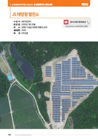 신·재생에너지가이드 2023 ▶ 신·재생에너지 설치사례 태양광 JS 태양광 발전소 •시 공 사 : (주)가온ENC 설치사례 홍보영상 •완 공 일 : 2020년 7월 25일 https://youtu.be/3bZMicsztBU •주 소 : 강원도 고성군 죽왕면 야촌리 산28 •설비용량 : 2MW •특 징 : CIP공법 306 New & Renewable Energy Guide 2023