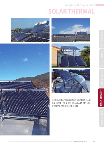 New & Renewable Energy Guide 2023 SOLAR THERMAL 신·재생에너지 홍보관 신·재생에너지 전시회 신·재생에너지 기업소개 대구광역시 달성군 옥포읍에 설치한 태양열 복합 시스템 신·재생에너지 설치사례 으로 태양열 난방 일 평균 70,000kcal를 생산하며, 태양열 온수 300L를 사용할 수 있다. 신·재생에너지 유관기관 신·재생에너지가이드 2023 341