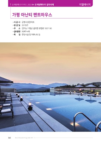 신·재생에너지가이드 2023 ▶ 신·재생에너지 설치사례 지열에너지 가평 아난티 펜트하우스 •시 공 사 : 공항시설관리㈜ •완 공 일 : 2015년 •주 소 : 경기도 가평군 설악면 유명로 1007-90 •설비용량 : 50RT=4대 •특 징 : 휴양시설 및 커뮤니티 등 362 New & Renewable Energy Guide 2023