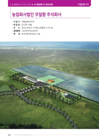 신·재생에너지가이드 2023 ▶ 신·재생에너지 설치사례 지열에너지 농업회사법인 우일팜 주식회사 •시 공 사 : 지엔원에너지(주) •완 공 일 : 2012년 12월 •주 소 : 경기도 화성시 서신면 궁평항로 1178-88 •설비용량 : 1,600RT(5,600kW) •특 징 : 국내 최대 유리온실 사업 364 New & Renewable Energy Guide 2023
