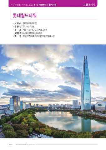 신·재생에너지가이드 2023 ▶ 신·재생에너지 설치사례 지열에너지 롯데월드타워 •시 공 사 : 지엔원에너지(주) •완 공 일 : 2016년 12월 •주 소 : 서울시 송파구 올림픽로 300 •설비용량 : 3,000RT(10,500kW) •특 징 : 단일 건물기준 최대 규모의 지열시스템 368 New & Renewable Energy Guide 2023