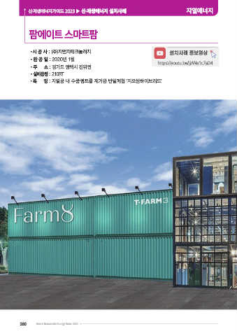 신·재생에너지가이드 2023 ▶ 신·재생에너지 설치사례 지열에너지 팜에이트 스마트팜 •시 공 사 : (주)지앤지테크놀러지 설치사례 홍보영상 •완 공 일 : 2020년 1월 https://youtu.be/jjANa1c7aD4 •주 소 : 경기도 평택시 진위면 •설비용량 : 210RT •특 징 : 지열공 내 수중펌프를 제거한 반밀폐형 ‘지오썸하이브리드’ 380 New & Renewable Energy Guide 2023