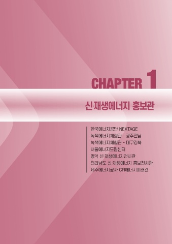 신·재생에너지 홍보관 CHAPTER CHAPTER1 1 한국에너지공단 NEXTAGE 녹색에너지체험관 - 광주전남 녹색에너지체험관 - 대구경북 서울에너지드림센터 영덕 신·재생에너지전시관 전라남도 신·재생에너지 홍보전시관 제주에너지공사 CFI에너지미래관