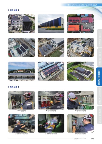 New & Renewable Energy Guide 2024 I 시공 사례 I 신·재생에너지 홍보관 신·재생에너지 전시회 I 점검 사례 I 신·재생에너지 기업소개 신·재생에너지 설치사례 ▲ PD부분방전측정 ▲ 고압측열화상측정 ▲ 고압측접지저항측정 신·재생에너지 유관기관 ▲ 발전기배터리전압측정 ▲ 보호계전기동작시험 ▲ 저압측접지저항측정 신·재생에너지가이드 2024 105
