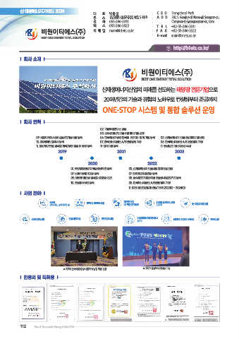 09. 비원이티에스(주) 설립/전기공사업 등록 06. 한국에너지공단 한국형 RE100 참여 기업 등록 03. 신재생에너지 보급사업 참여기업 선정