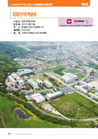 신·재생에너지가이드 2024 ▶ 신·재생에너지 설치사례 태양광 경찰인재개발원 •시 공 사 : 인피니티에너지㈜ 기업 홍보영상 •완 공 일 : 2021년 4월 23일 https://www.youtube.com/watch?v=mkwgjFNP4XQ •주 소 : 충청남도 아산시 무궁화로 111 •설비용량 : 2148.3kW •특 징 : 스페이스프레임 구조의 주차장형 244 New & Renewable Energy Guide 2024