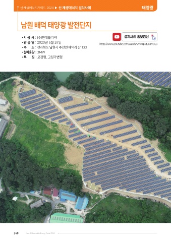 신·재생에너지가이드 2024 ▶ 신·재생에너지 설치사례 태양광 남원 배덕 태양광 발전단지 •시 공 사 : (주)현대쏠라텍 설치사례 홍보영상 •완 공 일 : 2020년 6월 24일 https://www.youtube.com/watch?v=w4pMLo3M3LU •주 소 : 전라북도 남원시 주천면 배덕리 산 133 •설비용량 : 3MW •특 징 : 고정형, 고정가변형 248 New & Renewable Energy Guide 2024