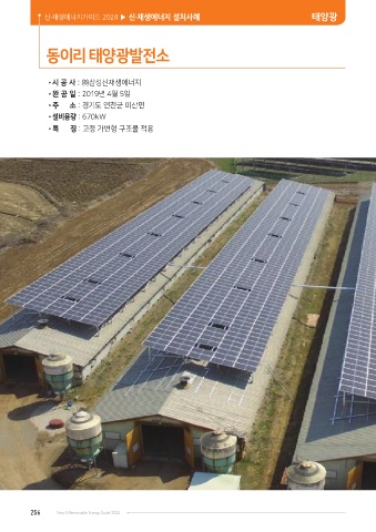 신·재생에너지가이드 2024 ▶ 신·재생에너지 설치사례 태양광 동이리 태양광발전소 •시 공 사 : ㈜삼성신재생에너지 •완 공 일 : 2019년 4월 5일 •주 소 : 경기도 연천군 미산면 •설비용량 : 670kW •특 징 : 고정 가변형 구조물 적용 256 New & Renewable Energy Guide 2024