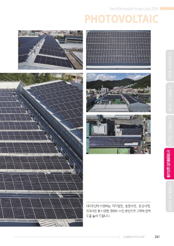 New & Renewable Energy Guide 2024 PHOTOVOLTAIC 신·재생에너지 홍보관 신·재생에너지 전시회 신·재생에너지 기업소개 (주)대신에스앤비는 자가발전, 발전사업, 공공사업, 신·재생에너지 설치사례 임대사업 등 다양한 형태의 사업 방법으로 고객의 만족 신·재생에너지 유관기관 도를 높여 드립니다. 신·재생에너지가이드 2024 261