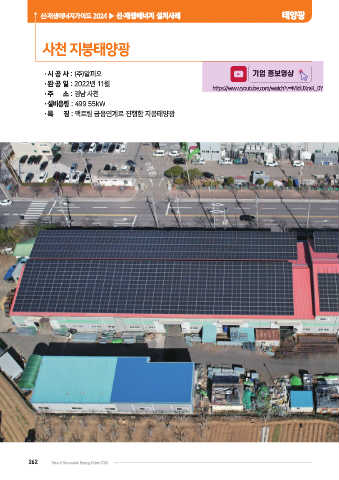 신·재생에너지가이드 2024 ▶ 신·재생에너지 설치사례 태양광 사천 지붕태양광 •시 공 사 : (주)알피오 기업 홍보영상 •완 공 일 : 2022년 11월 https://www.youtube.com/watch?v=MidUXraK_0Y •주 소 : 경남 사천 •설비용량 : 499.55kW •특 징 : 팩토링 금융연계로 진행한 지붕태양광 262 New & Renewable Energy Guide 2024