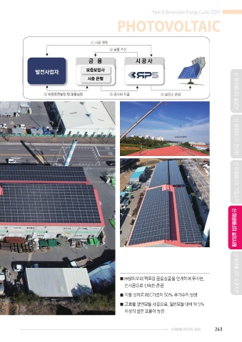 New & Renewable Energy Guide 2024 PHOTOVOLTAIC 신·재생에너지 홍보관 신·재생에너지 전시회 신·재생에너지 기업소개 ■ ㈜알피오의 팩토링 금융상품을 연계하여 무자본, 신·재생에너지 설치사례 선시공으로 신속한 준공 ■ 지붕 설치로 REC가중치 50% 추가수익 발생 신·재생에너지 유관기관 ■ 고효율 양면모듈 사용으로, 일반모듈 대비 약 5% 이상의 발전 효율이 높음 신·재생에너지가이드 2024 263