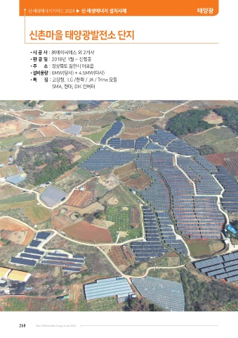 신·재생에너지가이드 2024 ▶ 신·재생에너지 설치사례 태양광 신촌마을 태양광발전소 단지 •시 공 사 : ㈜에이씨에스 외 2개사 •완 공 일 : 2018년 1월 ~ 진행중 •주 소 : 경상북도 김천시 아포읍 •설비용량 : 6MW(당사) + 4.5MW(타사) •특 징 : 고정형, LG /한화 / JA / Trina 모듈 SMA, 현대, DIK 인버터 268 New & Renewable Energy Guide 2024