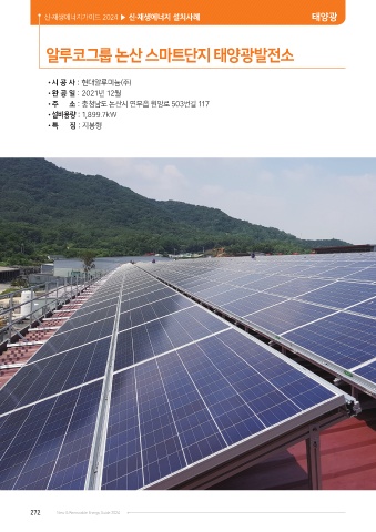 신·재생에너지가이드 2024 ▶ 신·재생에너지 설치사례 태양광 알루코그룹 논산 스마트단지 태양광발전소 •시 공 사 : 현대알루미늄(주) •완 공 일 : 2021년 12월 •주 소 : 충청남도 논산시 연무읍 원앙로 503번길 117 •설비용량 : 1,899.7kW •특 징 : 지붕형 272 New & Renewable Energy Guide 2024