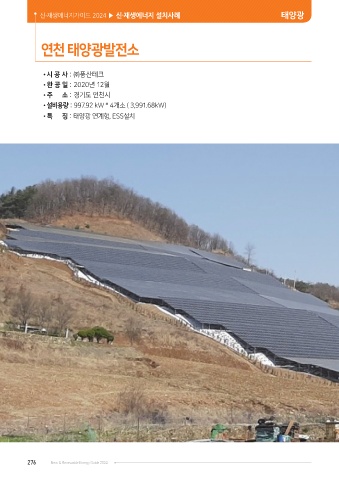신·재생에너지가이드 2024 ▶ 신·재생에너지 설치사례 태양광 연천 태양광발전소 •시 공 사 : ㈜풍산테크 •완 공 일 : 2020년 12월 •주 소 : 경기도 연천시 •설비용량 : 997.92 kW * 4개소 ( 3,991.68kW) •특 징 : 태양광 연계형, ESS설치 276 New & Renewable Energy Guide 2024