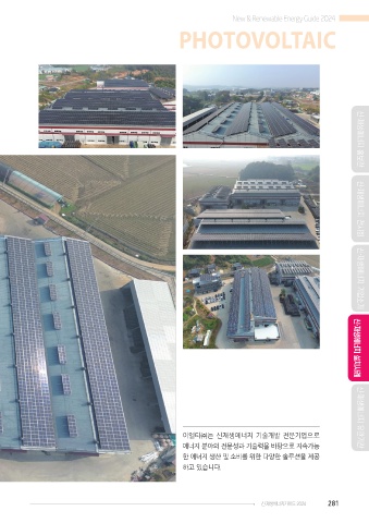 New & Renewable Energy Guide 2024 PHOTOVOLTAIC 신·재생에너지 홍보관 신·재생에너지 전시회 신·재생에너지 기업소개 이엘티㈜는 신재생에너지 기술개발 전문기업으로 신·재생에너지 설치사례 에너지 분야의 전문성과 기술력을 바탕으로 지속가능 신·재생에너지 유관기관 한 에너지 생산 및 소비를 위한 다양한 솔루션을 제공 하고 있습니다. 신·재생에너지가이드 2024 281