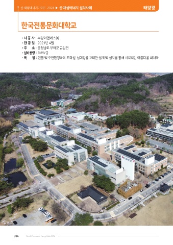 신·재생에너지가이드 2024 ▶ 신·재생에너지 설치사례 태양광 한국전통문화대학교 •시 공 사 : 부강이엔에스㈜ •완 공 일 : 2021년 4월 •주 소 : 충청남도 부여군 규암면 •설비용량 : 1MW급 •특 징 : 건물 및 주변환경과의 조화성, 심미성을 고려한 설계 및 설치를 통해 시각적인 아름다움 최대화 304 New & Renewable Energy Guide 2024