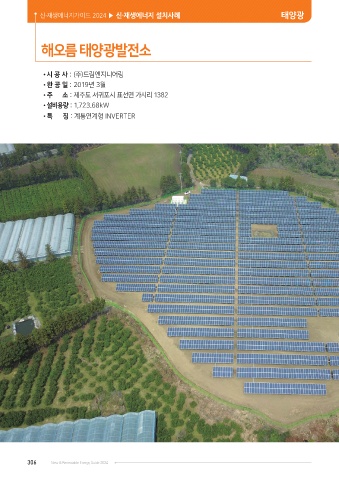 신·재생에너지가이드 2024 ▶ 신·재생에너지 설치사례 태양광 해오름 태양광발전소 •시 공 사 : (주)드림엔지니어링 •완 공 일 : 2019년 3월 •주 소 : 제주도 서귀포시 표선면 가시리 1382 •설비용량 : 1,723.68kW •특 징 : 계통연계형 INVERTER 306 New & Renewable Energy Guide 2024
