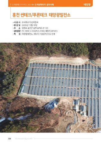 신·재생에너지가이드 2024 ▶ 신·재생에너지 설치사례 태양광 홍천 썬테크/푸른테크 태양광발전소 •시 공 사 : 주식회사 다빈이앤씨 •완 공 일 : 2020년 12월 16일 •주 소 : 강원도 홍천군 남면 유치리 산 123 •설비용량 : PV 2MW + ESS(PCS 2MW, 배터리 6MWh) •특 징 : 태양광발전소, 에너지 저장장치(ESS) 연계 308 New & Renewable Energy Guide 2024