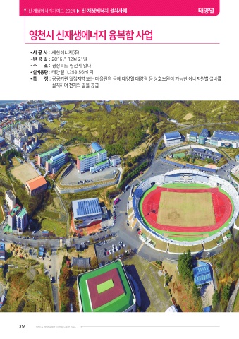 신·재생에너지가이드 2024 ▶ 신·재생에너지 설치사례 태양열 영천시 신재생에너지 융복합 사업 •시 공 사 : 세한에너지(주) •완 공 일 : 2016년 12월 21일 •주 소 : 경상북도 영천시 일대 •설비용량 : 태양열 1,258.56㎥ 외 •특 징 : 공공기관 밀집지역 또는 마을단위 등에 태양열·태양광 등 상호보완이 가능한 에너지원별 설비를 설치하여 전기와 열을 공급 316 New & Renewable Energy Guide 2024
