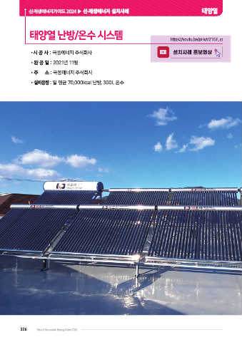 신·재생에너지가이드 2024 ▶ 신·재생에너지 설치사례 태양열 태양열 난방/온수 시스템 https://youtu.be/pHuV21GF_cc •시 공 사 : 극동에너지 주식회사 설치사례 홍보영상 •완 공 일 : 2021년 11월 •주 소 : 극동에너지 주식회사 •설비용량 : 일 평균 70,000kcal 난방, 300L 온수 326 New & Renewable Energy Guide 2024
