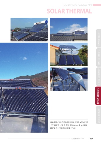 New & Renewable Energy Guide 2024 SOLAR THERMAL 신·재생에너지 홍보관 신·재생에너지 전시회 신·재생에너지 기업소개 대구광역시 달성군 옥포읍에 설치한 태양열 복합 시스템 신·재생에너지 설치사례 신·재생에너지 유관기관 으로 태양열 난방 일 평균 70,000kcal를 생산하며, 태양열 온수 300L를 사용할 수 있다. 신·재생에너지가이드 2024 327