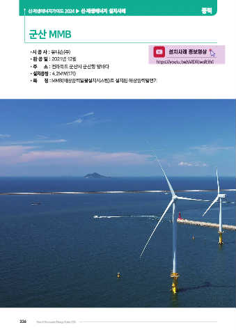 신·재생에너지가이드 2024 ▶ 신·재생에너지 설치사례 풍력 군산 MMB •시 공 사 : 유니슨(주) 설치사례 홍보영상 •완 공 일 : 2021년 12월 https://youtu.be/sMDRJwsR3h0 •주 소 : 전라북도 군산시 군산항 앞바다 •설치용량 : 4.2MW(1기) •특 징 : MMB(해상풍력일괄설치시스템)로 설치된 해상풍력발전기 336 New & Renewable Energy Guide 2024