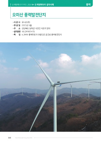 신·재생에너지가이드 2024 ▶ 신·재생에너지 설치사례 풍력 오미산 풍력발전단지 •시 공 사 : 유니슨(주) •완 공 일 : 2023년 5월 •주 소 : 경상북도 봉화군 석포면 석포리 일대 •설치용량 : 60.2MW(14기) •특 징 : 4.3MW 풍력터빈이 대량으로 공급된 풍력발전단지 340 New & Renewable Energy Guide 2024