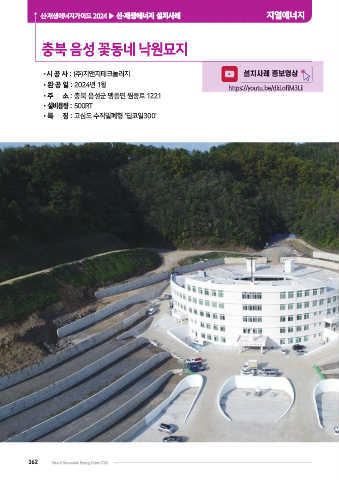 신·재생에너지가이드 2024 ▶ 신·재생에너지 설치사례 지열에너지 충북 음성 꽃동네 낙원묘지 •시 공 사 : (주)지앤지테크놀러지 설치사례 홍보영상 •완 공 일 : 2024년 1월 https://youtu.be/dkLofiM3LiI •주 소 : 충북 음성군 맹동면 원중로 1221 •설비용량 : 500RT •특 징 : 고심도 수직밀폐형 ‘딥코일300’ 362 New & Renewable Energy Guide 2024