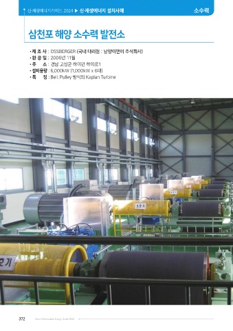 신·재생에너지가이드 2024 ▶ 신·재생에너지 설치사례 소수력 삼천포 해양 소수력 발전소 •제 조 사 : OSSBERGER (국내 대리점 : 남양이앤이 주식회사) •완 공 일 : 2006년 11월 •주 소 : 경남 고성군 하이면 하이로1 •설비용량 : 6,000kW (1,000kW x 6대) •특 징 : Belt Pulley 방식의 Kaplan Turbine 372 New & Renewable Energy Guide 2024