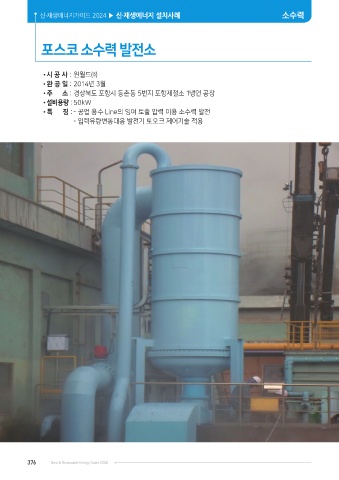 신·재생에너지가이드 2024 ▶ 신·재생에너지 설치사례 소수력 포스코 소수력 발전소 •시 공 사 : 윈월드㈜ •완 공 일 : 2014년 3월 •주 소 : 경상북도 포항시 동촌동 5번지 포항제철소 1냉연 공장 •설비용량 : 50kW •특 징 : - 공업 용수 Line의 잉여 토출 압력 이용 소수력 발전 - 입력유량변동대응 발전기 토오크 제어기술 적용 376 New & Renewable Energy Guide 2024