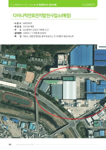 신·재생에너지가이드 2024 ▶ 신·재생에너지 설치사례 수소연료전지 다이나믹연료전지발전사업소(예정) •시 공 사 : ㈜비젼테크 •완 공 일 : 2025년 예정 •주 소 : 부산광역시 금정구 개좌로 인근 •설치용량 : 20MW / 그 외에 총 60MW •특 징 : 저탄소, 친환경 발전을 통해 온실가스 및 미세먼지 발생 최소화 382 New & Renewable Energy Guide 2024